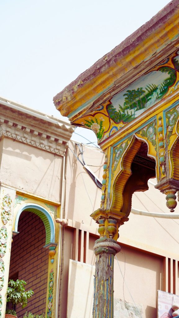 1200 m sopra il livello del mare. I monti del Pamir a nord-ovest, il deserto del Taklamakan (deserto piu grande in Cina) a sud e i monti Tianshan a nord-est. E’ una città bazaar, ricca di mercati con tè, spezie e artigianato vario. Prima della demolizione della sua città vecchia era definita come città islamica meglio conservata nella parte dell’Asia Centrale. La bellezza resta nonostante sia stata in parte ricostruita. Sono i colori quelli che saltano agli occhi a prima vista nonostante i due giorni di sabbia a causa di un tempesta di passaggio. Le strade, i fiori, i vasi, porte e finestre, e qualsiasi ornamente continua a emanare una luce particolare. Restano ancora case tradizionali con cortili, divanetti, tappeti e fontane. Le mura esterne sono fatte di mattoni di fango. Mentre passeggio per cercare una casa da tè sento qualcuno che dice: “Qui non piove”, il cameriere vede che osservo le pareti esterne, per me così estranee, abituata al cemento.